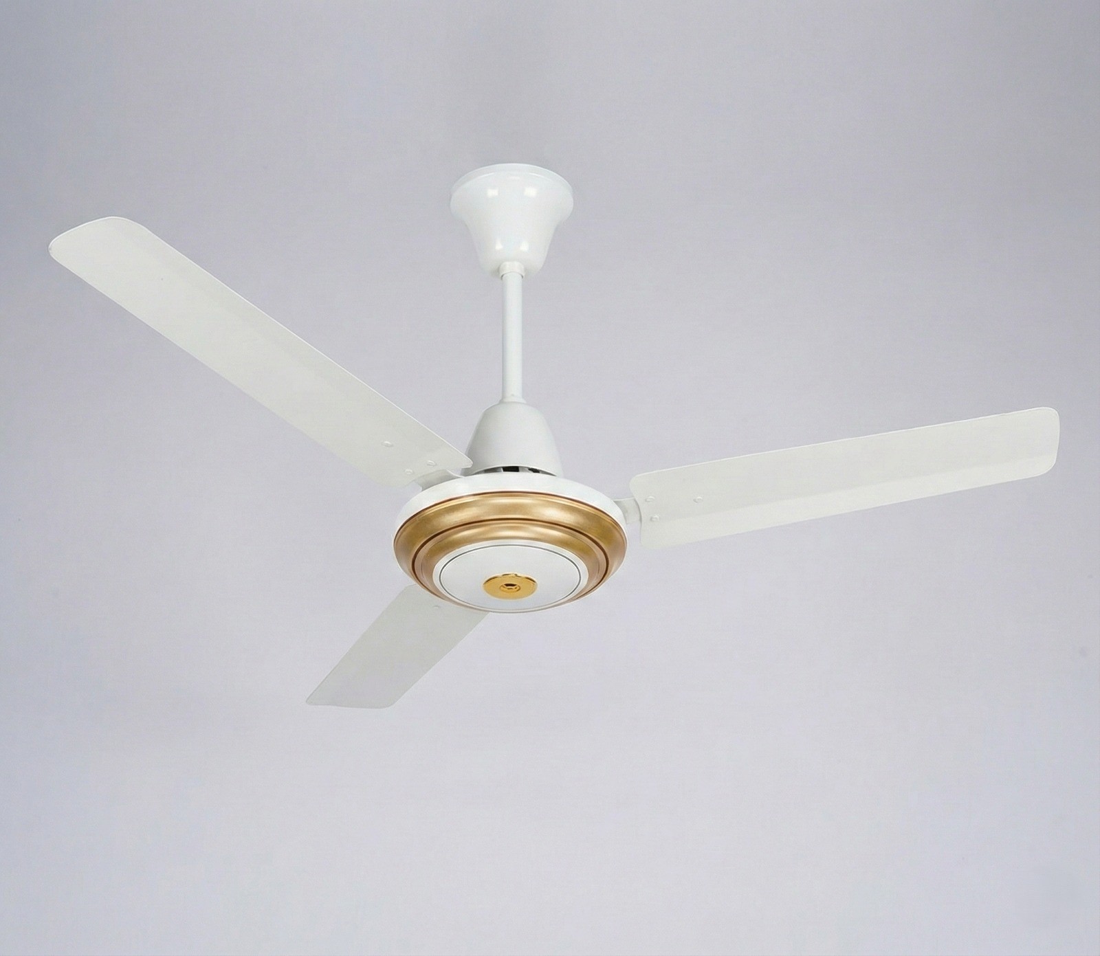 Luxurious ceiling fan featuring a white body with intricate gold plating on the motor grille and blade irons. Export-quality design for a premium look.