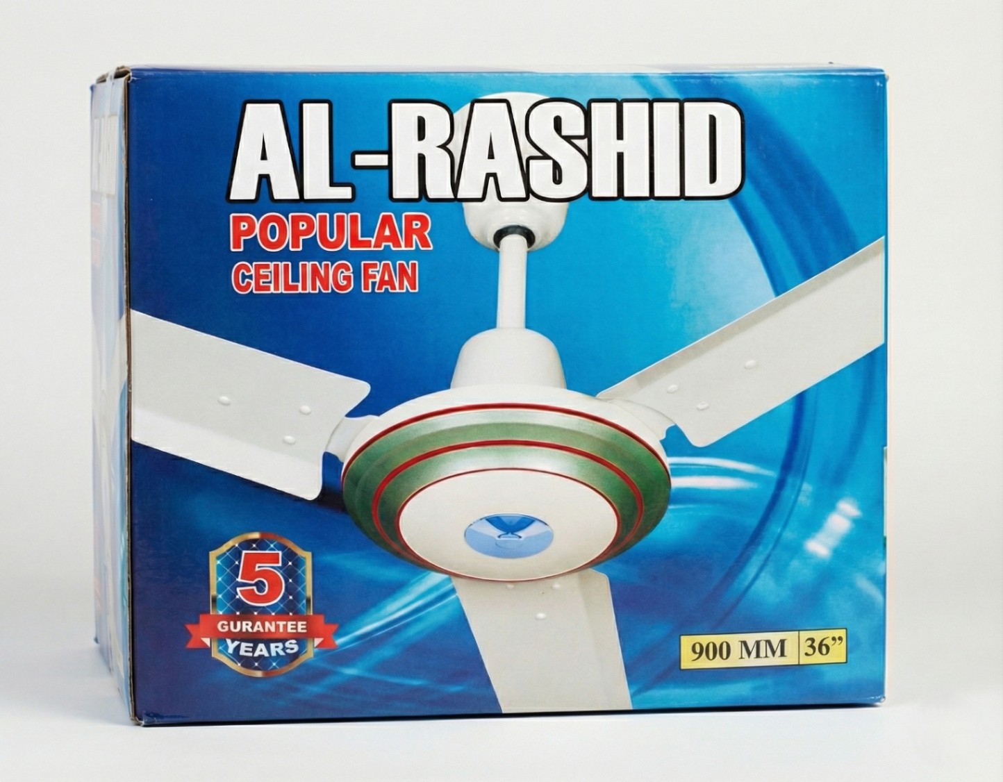 The Al-Rashid Popular Ceiling Fan is a reliable choice for everyday cooling. Designed with a classic aesthetic featuring decorative green and red rings on the motor housing, this fan blends traditional style with robust performance. It is built to deliver high air volume suitable for homes, shops, and offices. Key Features: Heavy Duty Motor: Engineered for continuous operation and long-lasting performance. Design: Classic white finish with distinctive green and red accent stripes and a blue centre cap. Blade Sweep: 36-inch (900 mm) steel blades ensure wide air distribution. Warranty: Comes with a 5-Year Guarantee for peace of mind. Efficiency: Designed to provide maximum airflow with optimal energy consumption.