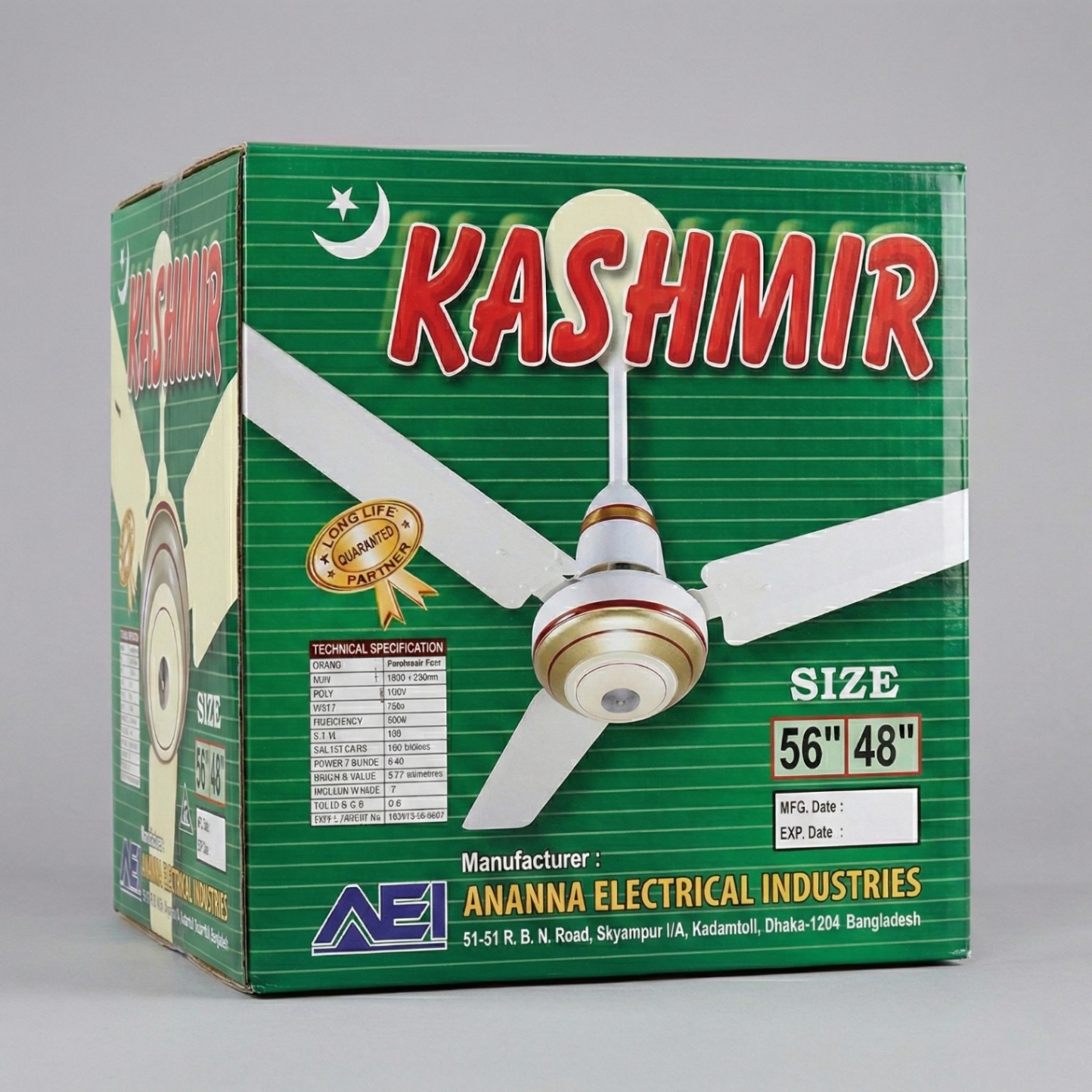 Regular Kashmir Fan. Cream body, gold rings, energy saver, durable performance guarantee.