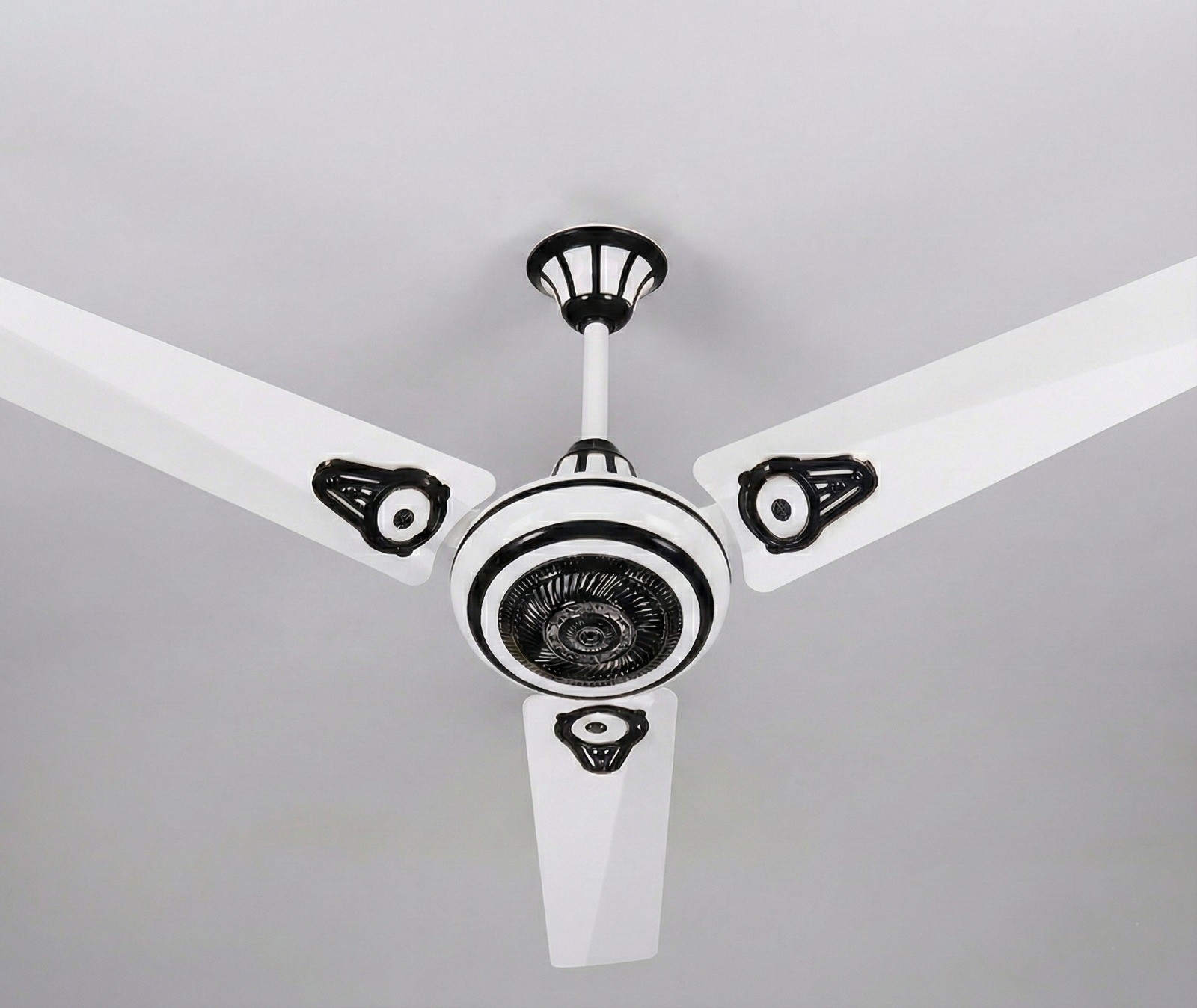 The Kashmir Gold Snow White Fan features a distinctive aesthetic with a white body accented by bold black decorative elements on the motor housing and blade trims. Manufactured by Global Electrical Industries, this model is designed with a 1400 mm size specification. The fan is BSTI approved (BDS-818:2006), ensuring adherence to established quality standards. For long-term reliability, the product is supported by a 10-year replacement guarantee.