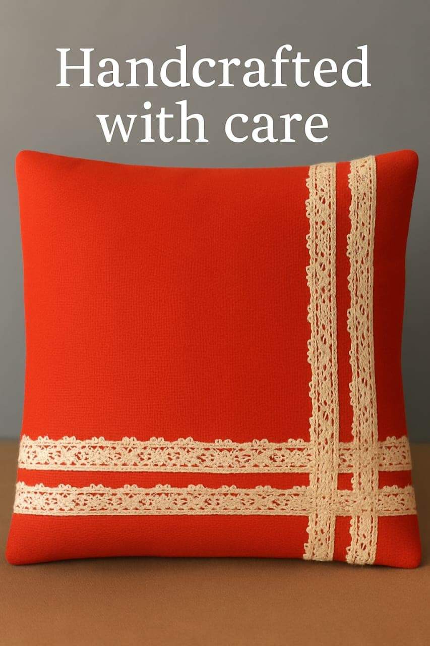 Handcrafted red jute-cotton cushion cover, accented with elegant cream lace detailing.